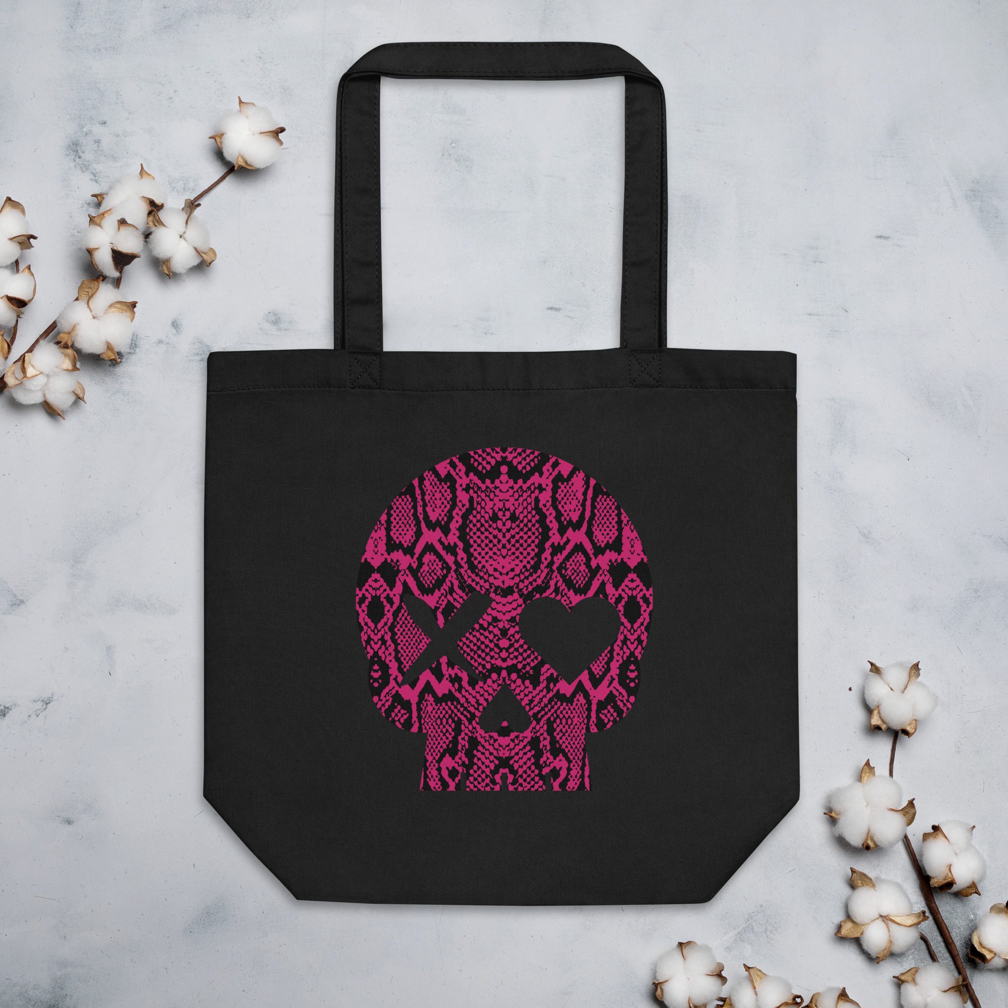 Los bolsos de algodón 100% orgánico de SkullsLover® son el complemento perfecto para tus looks más rebeldes del día a día, con espacio suficiente para poder salir con los amigos, ir de compras o ir al trabajo. Nuestros bolsos con calavera de estampado serpiente rosa, destacan por su elevada resistencia y durabilidad, además de ser respetuosos con el medio ambiente.