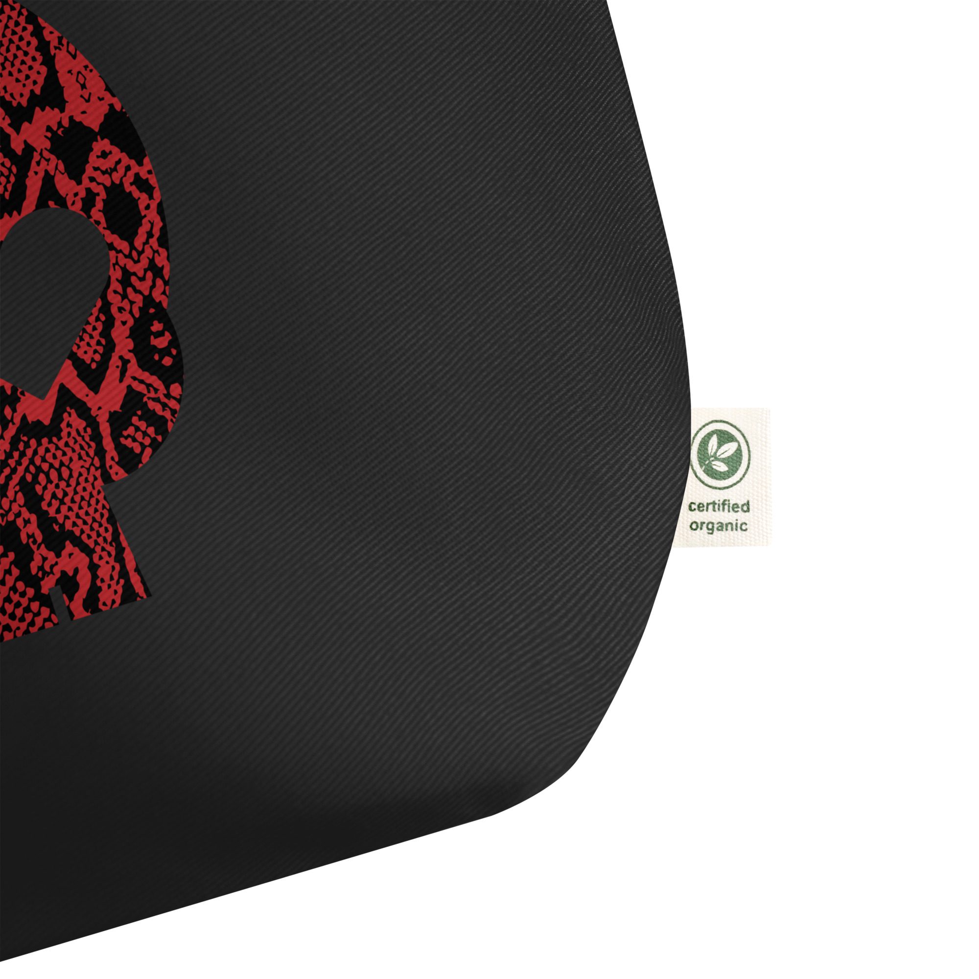 En los bolsos grandes de algodón 100% orgánico de SkullsLover®, cabe de todo. Si posees un espíritu rebelde y te preocupa el medio ambiente, este es el bolso perfecto para llenarlo de ropa, libros, compras, etc. Nuestro bolso calavera de estampado serpiente rojo, destaca por su gran capacidad y su enorme resistencia y durabilidad, además de ser totalmente ecológico.