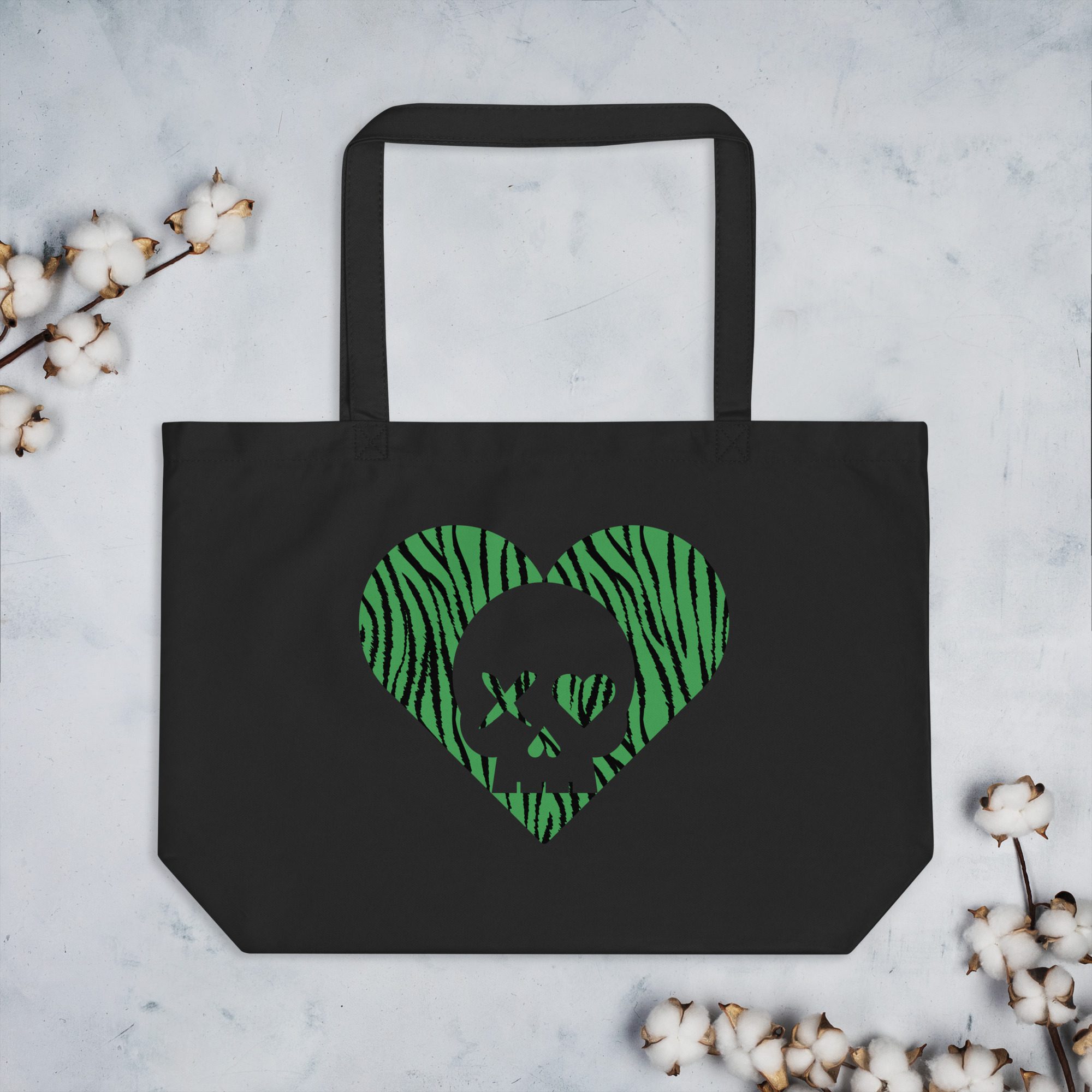 En los bolsos grandes de algodón 100% orgánico de SkullsLover®, cabe de todo. Si posees un espíritu rebelde y te preocupa el medio ambiente, este es el bolso perfecto para llenarlo de ropa, libros, compras, etc. Nuestro bolso corazón calavera de estampado cebra verde, destaca por su gran capacidad y su enorme resistencia y durabilidad, además de ser totalmente ecológico.
